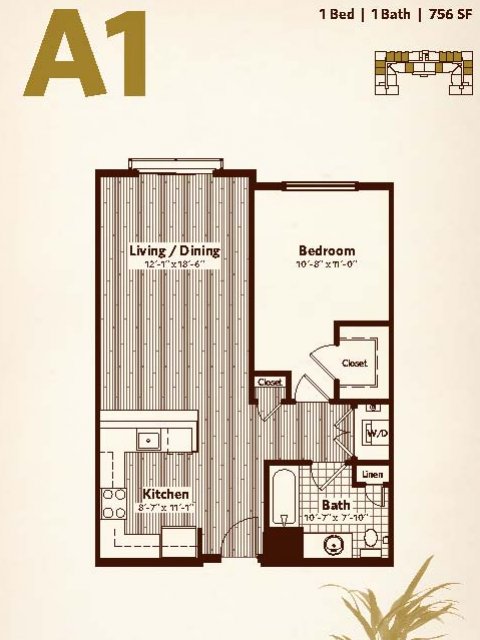 Modelo de apartamento: A1$2,5021 Dormitorio, 1 Baño, 756 sq ftDisponible AhoraLos planos de la planta son una interpretación artística. Todas las dimensiones son aproximadas. Los tamaños o el detalle del producto real y sus especificaciones pueden variar. No todas las características están disponibles en todos los hogares para rentar. Los precios y la disponibilidad están sujetos a cambios. El alquiler que se muestra es mensual. Se pueden aplicar ciertos cargos, por ejemplo, entrega de paquetes, recolección de basura, agua, servicios, etc. Depositos varian. Consulta a un representante para conocer detalles.