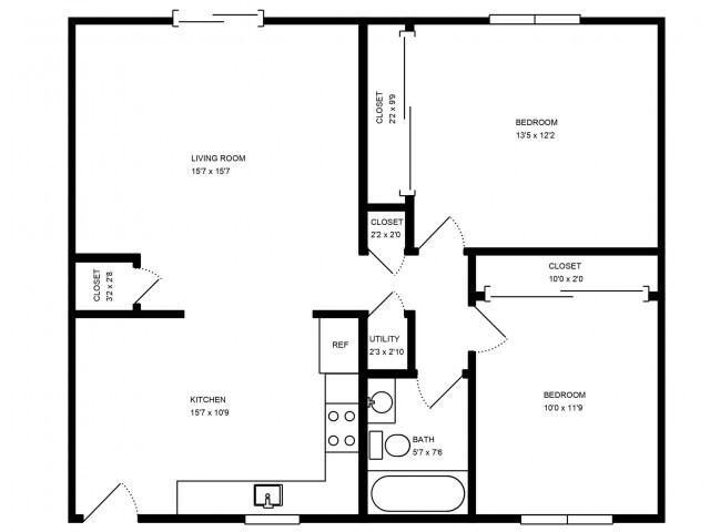 Modelo de apartamento: Two Bedroom2 Dormitorios, 1 Baño, 890 sq ftNo DisponibleTwo Bedroom - Plano 1