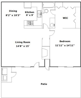 Modelo de apartamento: 1x1Desde $1,0501 Dormitorio, 1 Baño, 850 sq ftDisponible Ahora1x1 - Plano 1 2 Dormitorios