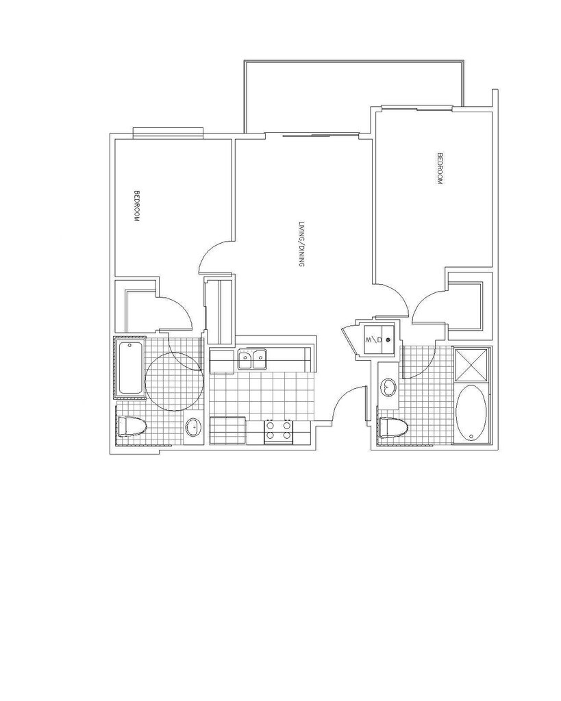 Revello 2x2 - Plano 1 Unidad de apartamento: RV412Modelo de apartamento: Revello 2x22 Dormitorios, 2 Baños, 843 sq ftDisponible AhoraRevello 2x2