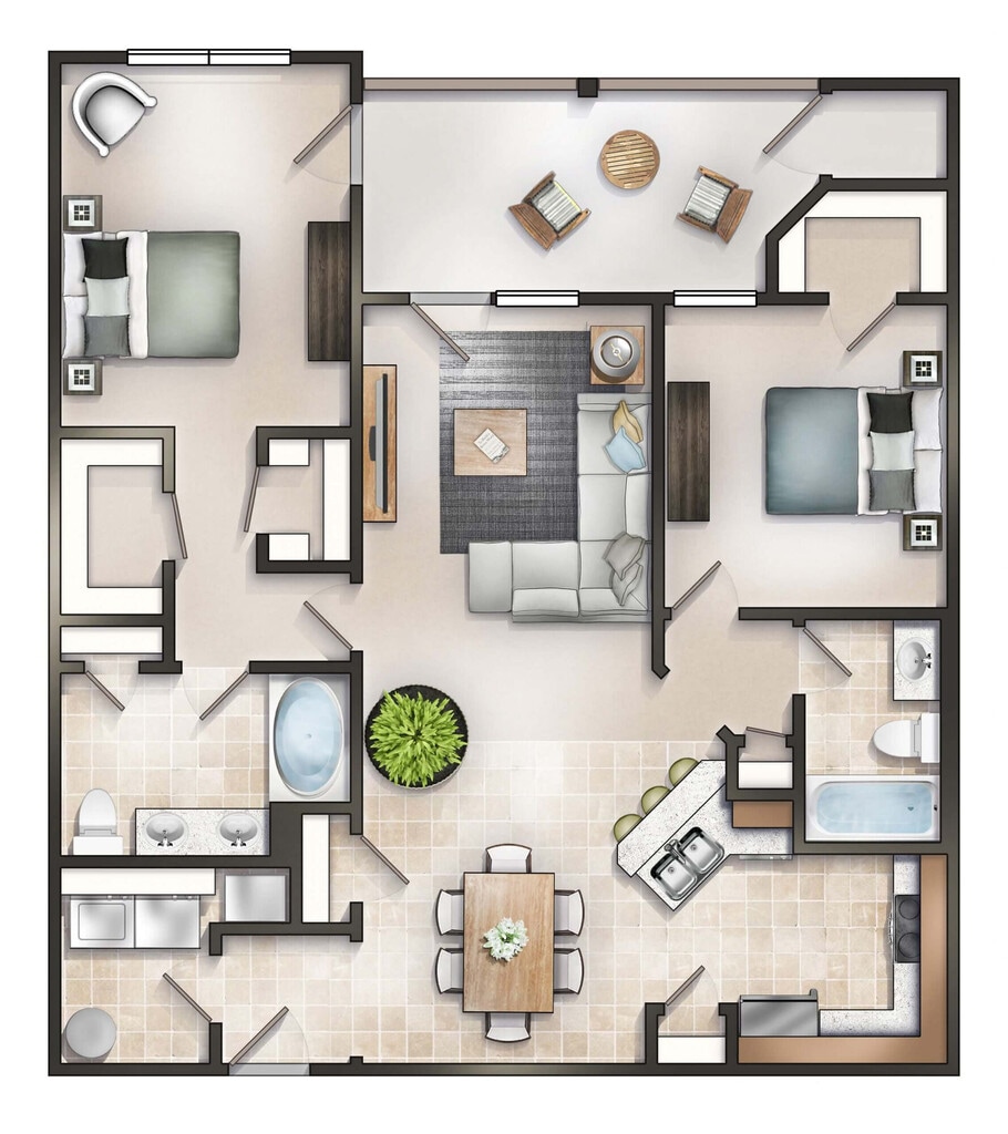 2 Dormitorios, 1 Baño, 1152 pies²Disponible AhoraGalería del Modelo