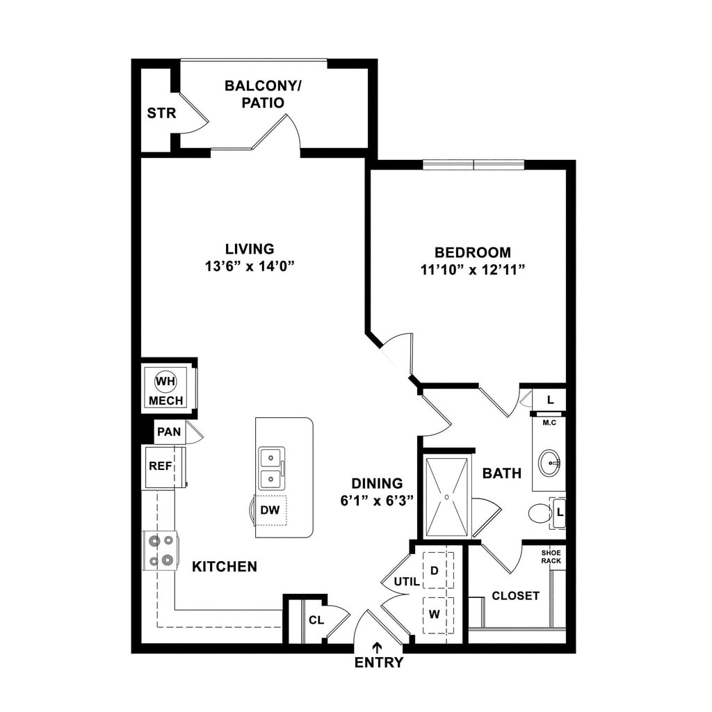 Modelo de apartamento: A1Desde $8651 Dormitorio, 1 Baño, 804 sq ftDisponible Ahora![]()