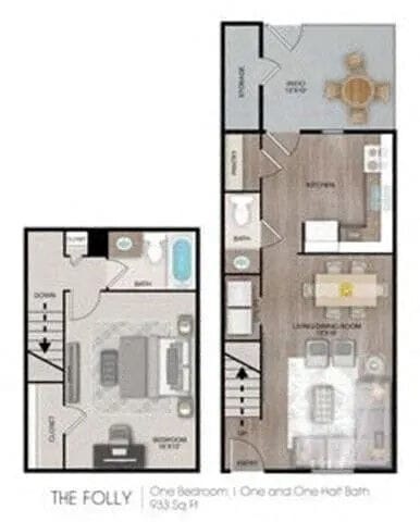 1 Dormitorio, 1.5 Baños, 933 pies²Disponible AhoraGalería del Modelo