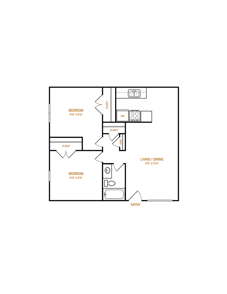 Modelo de apartamento: A1Llame para Precios1 Dormitorio, 1 Baño, 550 sq ftNo Disponible![]()