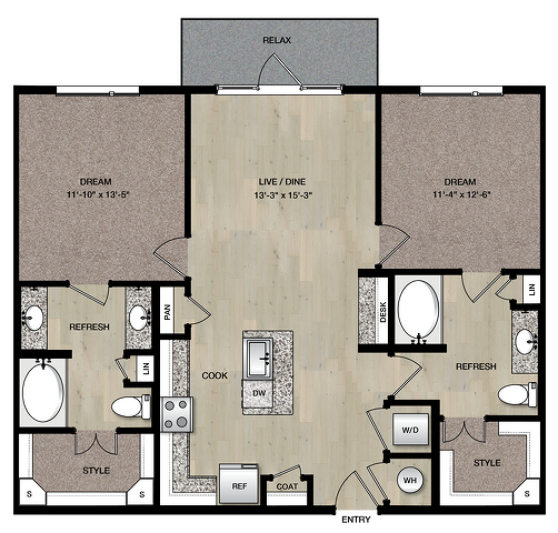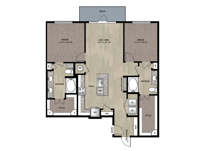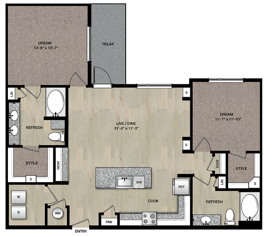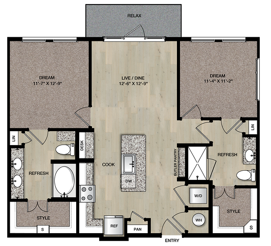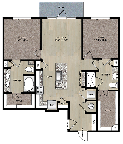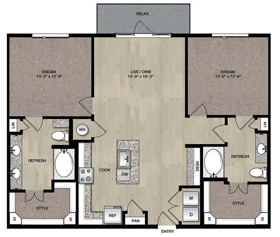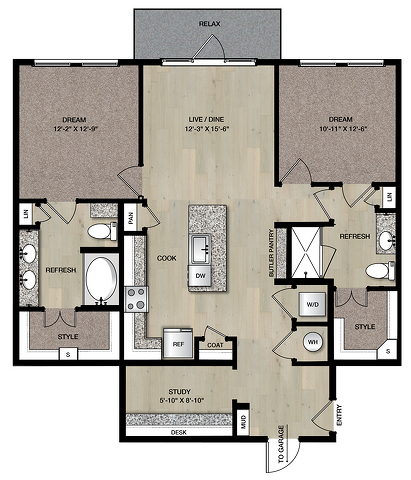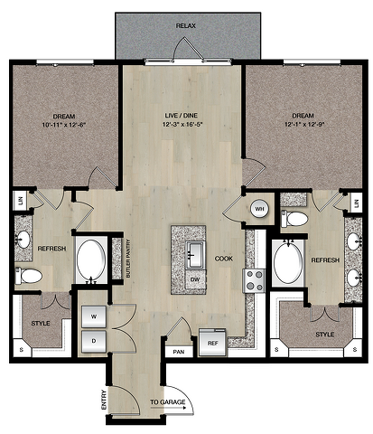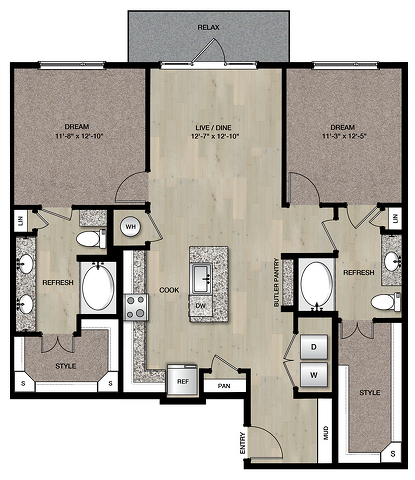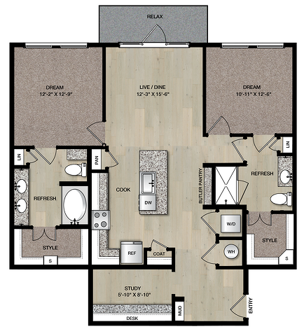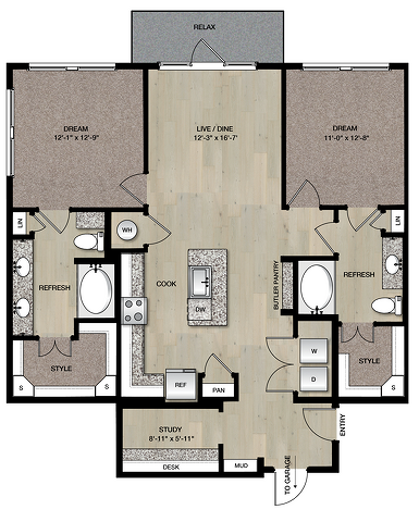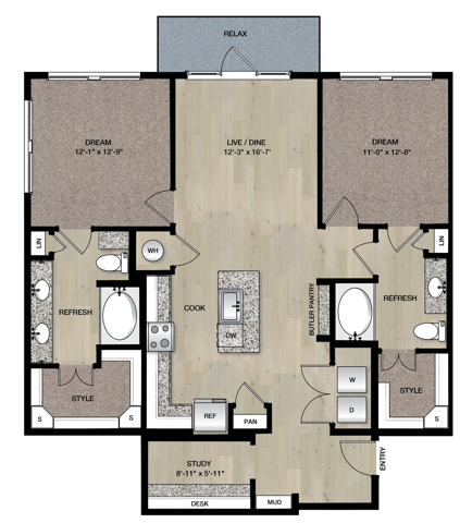Modelo de apartamento: E2Desde $1,3901 Dormitorio, 1 Baño, 682-683 sq ftDisponible Ahora![]()