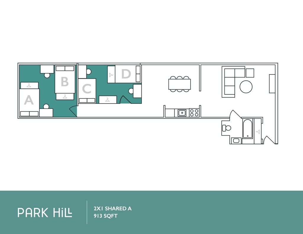 Modelo de apartamento: 2x1 SharedDesde $1,0842 Dormitorios, 1 Baño, 936 sq ftDisponible Ahora![]()