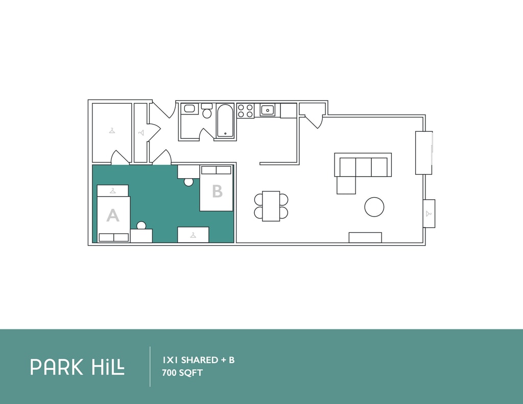 Modelo de apartamento: 1x1 Shared +$1,4501 Dormitorio, 1 Baño, 630-700 sq ftDisponible August 18, 2026![]()