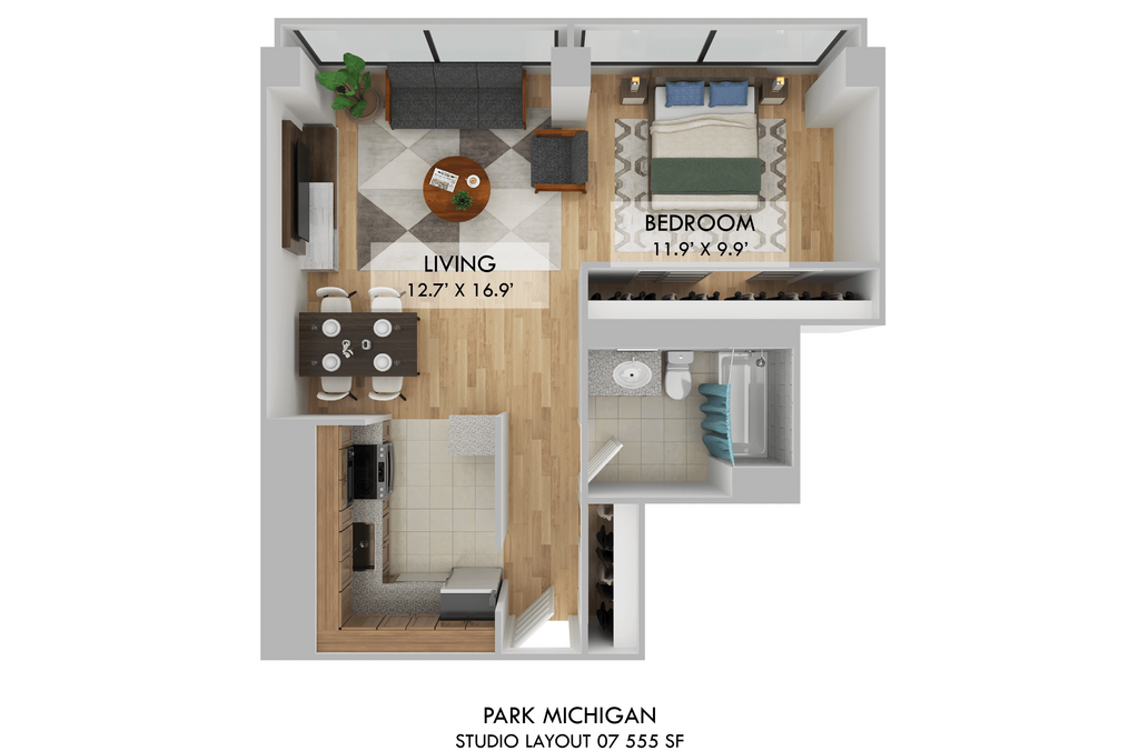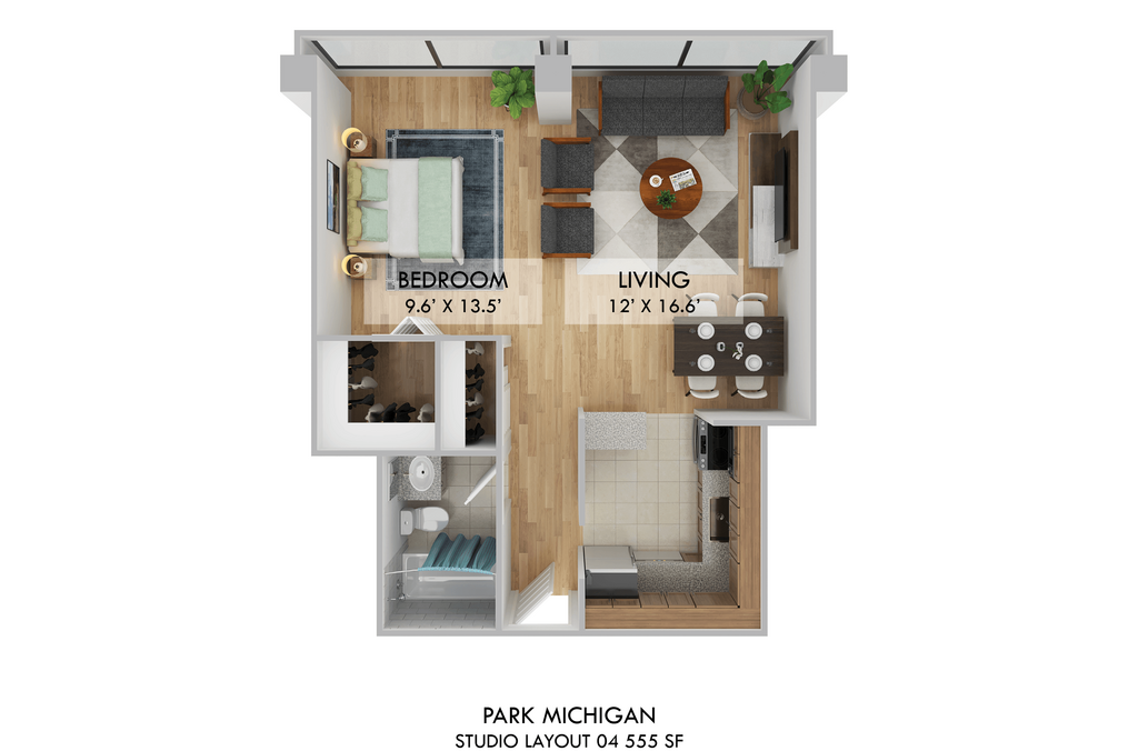 Estudio, 1 Baño, 555 pies²Disponible AhoraGalería del Modelo