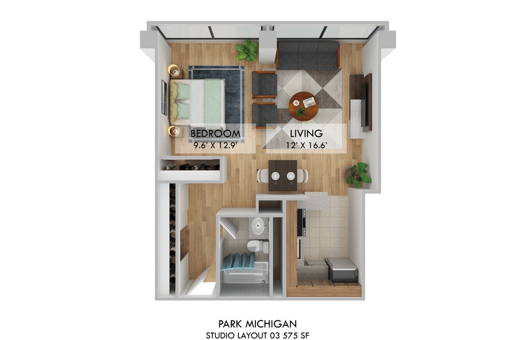 Estudio, 1 Baño, 570 pies²Disponible AhoraGalería del Modelo