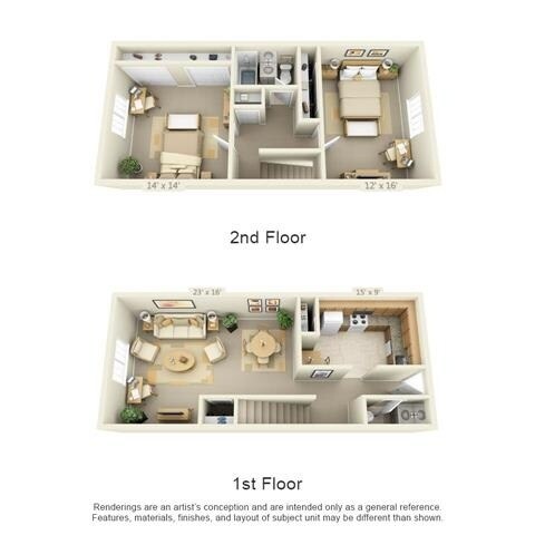 Modelo de apartamento: 2 Bedroom Townhouse$1,5402 Dormitorios, 1 Baño, 1000 sq ftNo Disponible![]()