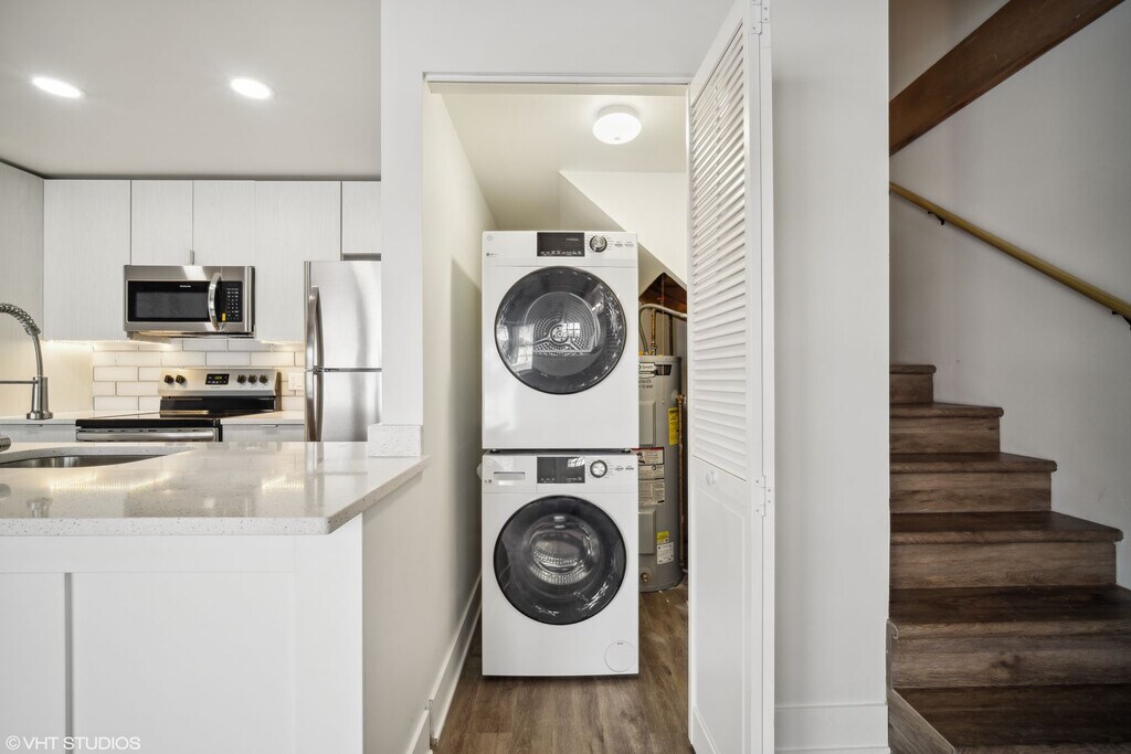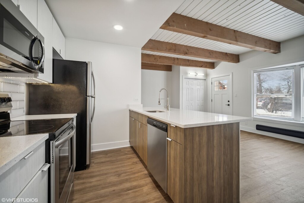 Open concept 1 and 2 bedroom 1.5 bath townhome in downtown Highland Park. Park Townhomes features custom kitchens with stainless steel appliances, quartz countertops, new cabinetry, and an island countertop with room for seating. The open-concept floor plan is highlighted with laminate hardwood floors and a modern color scheme throughout, which is perfect for entertaining, cooking, and relaxing. Stunning exposed wood beams across the ceiling of the living room and an exposed brick wall create a tranquil living experience. The staircase leads to the loft-style suite that features a vaulted ceiling and spacious walk-in closet as well as a brand new full bathroom. Spacious windows brighten the upper and lower levels. In-unit laundry. On-site parking lot for your convenience. Steps from the 38-acre tree-filled Sunset Park. Walking distance to the Metra Train Station, Sunset Foods grocery store, and numerous restaurants and shops. The beautiful beaches of Lake Michigan are a very short drive or a leisurely walk. Near Highland Park Hospital and accessible to the Edens Expressway, Highway 41, and Sheridan Road. Take advantage of all that Highland Park has to offer!