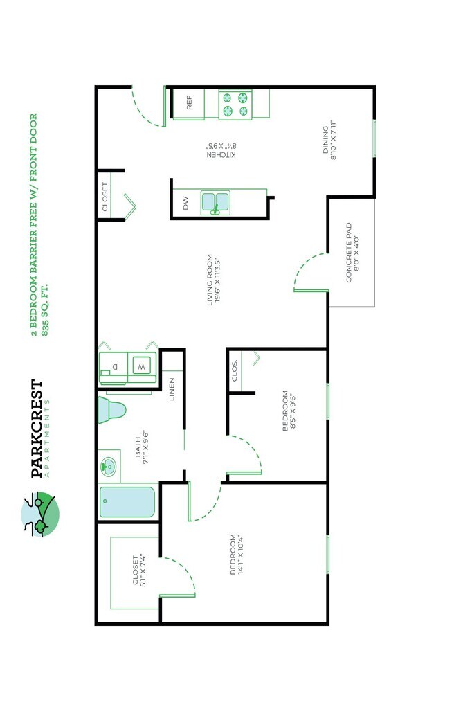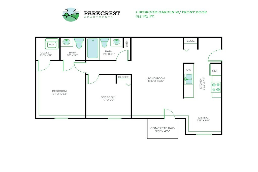 2 Bed, 1 Bath - 835 sq ft - Plano 1 2 Bed, 1.5 Bath - 835 sq ft