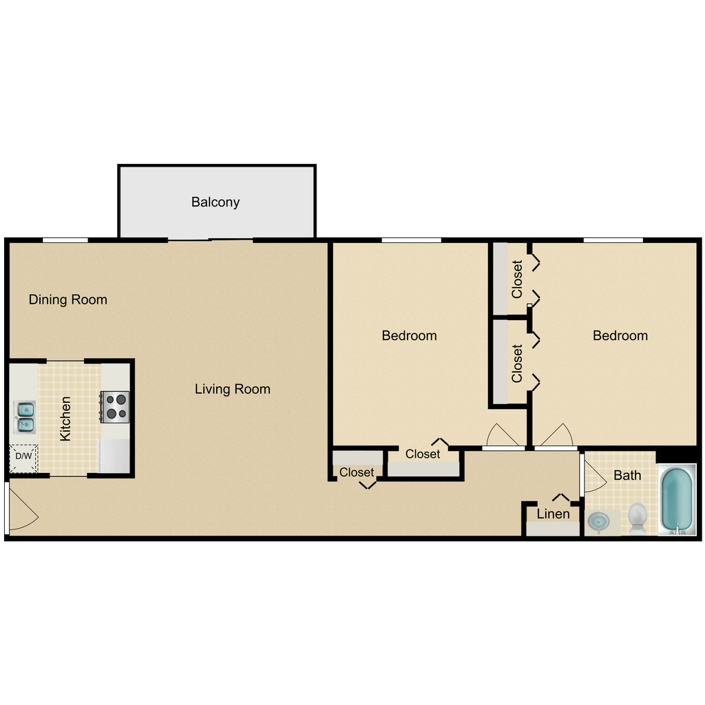2 Dormitorios, 1 Baño, 980 pies²Precio Mensual TotalDisponible AhoraGalería del Modelo
