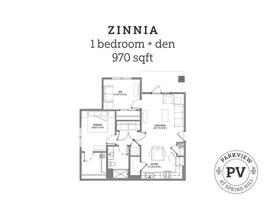 Modelo de apartamento: Zinnia$1,4991 Dormitorio, 1 Baño, 970 sq ftDisponible Ahora![]()