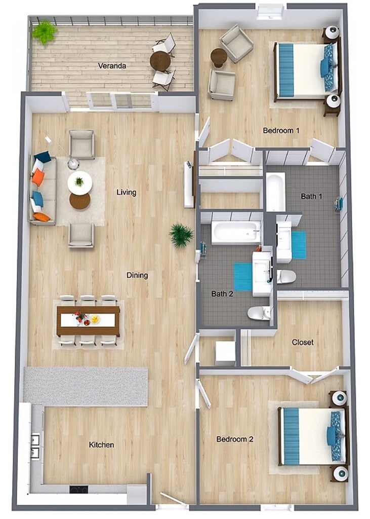 2 Dormitorios, 2 Baños, 1040 pies²Disponible AhoraGalería del Modelo