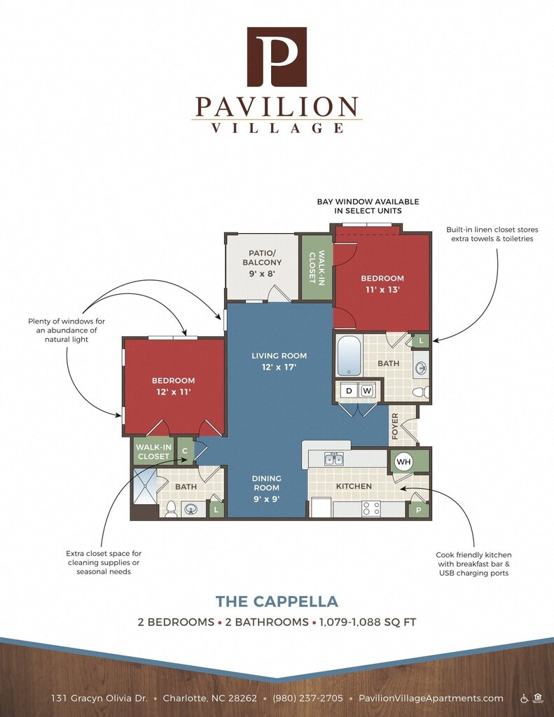 Ya sea que desees relajarte después de un duro día en la oficina o jugar, Pavilion Village en Charlotte, NC, ofrece comodidades que hacen de tu hogar algo más que un lugar para comer y dormir. Nuestros apartamentos no solo son nuevos, sino que también ofrecen toques de diseñador como gabinetes color café. Admitimos mascotas con un parque para perros y una estación de lavado de mascotas. Aprovecha la oportunidad de vivir en uno de los mejores complejos de apartamentos en Charlotte, NC. Imagínate llegar a casa todos los días con el cálido abrazo de un paisaje meticuloso, un hogar cómodo y comodidades pensadas para mejorar tu vida. Ubicado en Charlotte, con fácil acceso a South Tryon Street y la Interestatal 485, Pavilion Village está a solo minutos de Charlotte Motor Speedway, así como de todas las tiendas, restaurantes y lugares de entretenimiento que la cercana Concord tiene para ofrecer. Pavilion Village ofrece a sus residentes una amplia selección de exclusivos apartamentos de una, dos y tres habitaciones que cuentan con comodidades exclusivas para el hogar y la comunidad, como un gimnasio abierto las 24 horas, los 7 días de la semana, una lavadora/secadora en el apartamento y una piscina estilo centro turístico que completan el panorama. Ven a mover los dedos de los pies en nuestra pintoresca piscina, pasea por nuestro complejo que admite mascotas con tu compañero de cuatro patas favorito o pasa un día en la ciudad en las cercanías de Concord. Sabemos que mereces lo mejor en apartamentos y nuestro complejo está diseñado específicamente para asegurarte que no solo alquiles, sino que también vivas. ¡Te invitamos a ver nuestra galería de fotos y a programar una cita, o visítanos hoy y te daremos un recorrido personal!