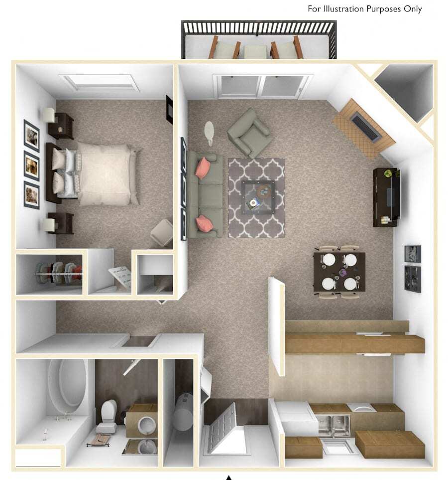 Modelo de apartamento: StudioLlame para PreciosEstudio, 1 Baño, 500 sq ftNo Disponible![]()