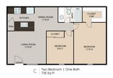 Modelo de apartamento: 2x1$1,1072 Dormitorios, 1 Baño, 735 sq ftDisponible Ahora![]()