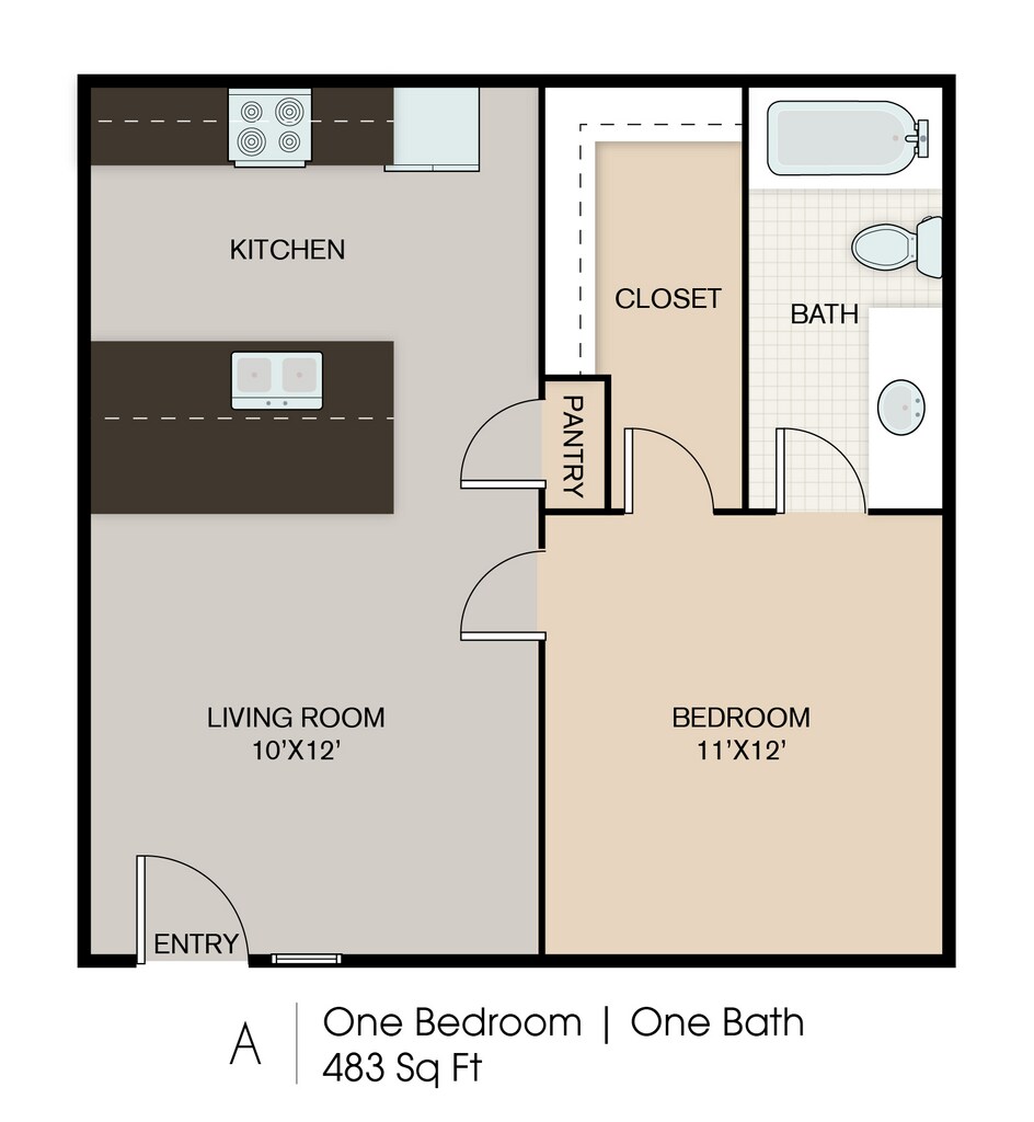 Modelo de apartamento: 1x1Llame para Precios1 Dormitorio, 1 Baño, 483 sq ftNo Disponible![]()