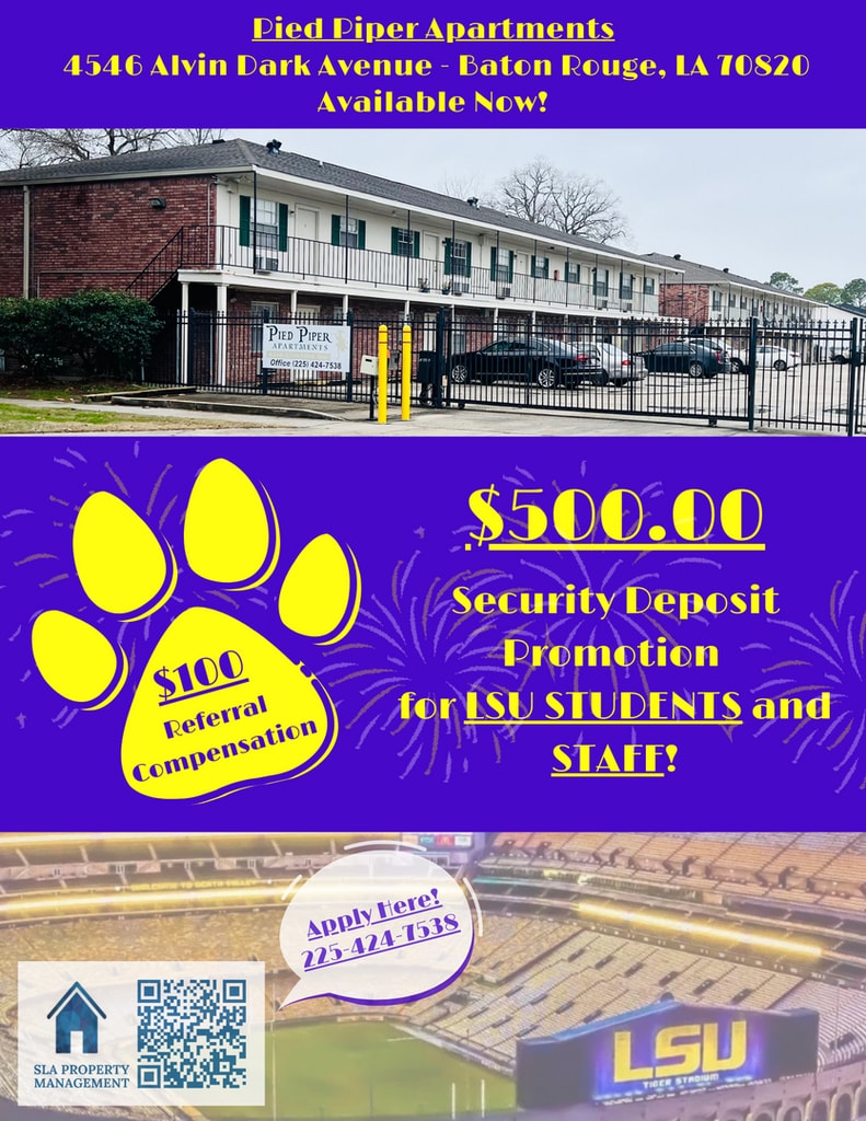 Pied Piper Apartments 4546 Alvin Dark Ave Baton Rouge, LA 70820 Units, 1-39 Studio/1 Bath, 494 Sq. Ft. Section 8 Accepted! Newly updated, spacious 1st floor Studio Apartment with a large walk-in closet, ceiling fan, refrigerator, oven, and online portal and mobile app. Gated Community with a security camera system on the bus route and minutes from LSU. Amenities: * Gated Community * Gated Parking * Laundry Facility On Site Included In Rent: * Water * Waste Disposal * Pest Control Rental Terms: * Rent: $695 * Security Deposit: $695 * Application Fee: $50 (per adult) * Monthly income must be greater than 2.5 times the rent. * Online portal use. * Two people maximum. Pet Policy: * Pets are not allowed on the property unless registered as an ESA or Service Animal, with provided documentation.