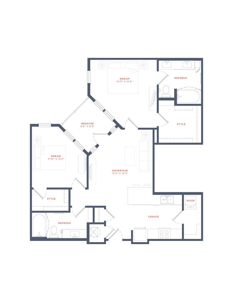 1 Dormitorio, 1 Baño, 857 pies²Disponible AhoraEl más grandeEsta opción tiene las unidades más grandes para este modeloGalería del Modelo