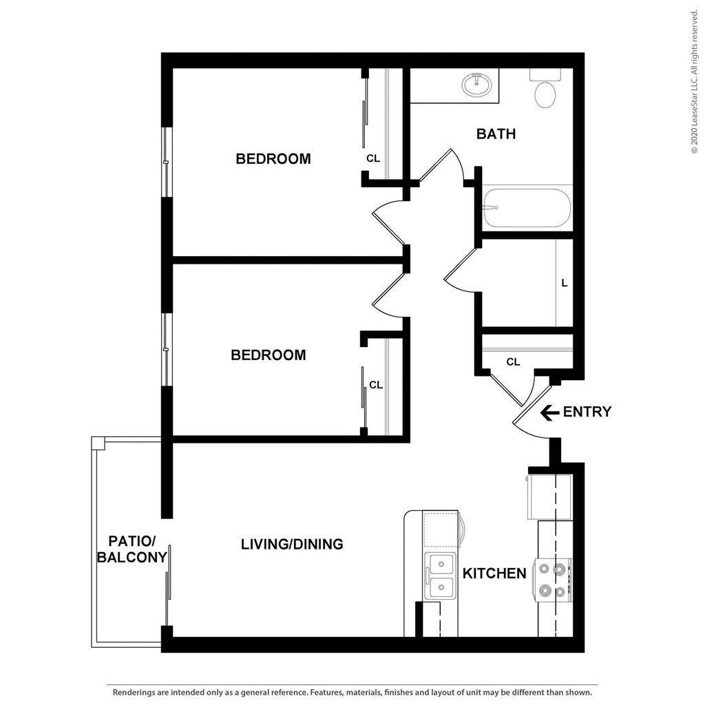 2 Dormitorios, 1 Baño, 752 pies²Galería del Modelo
