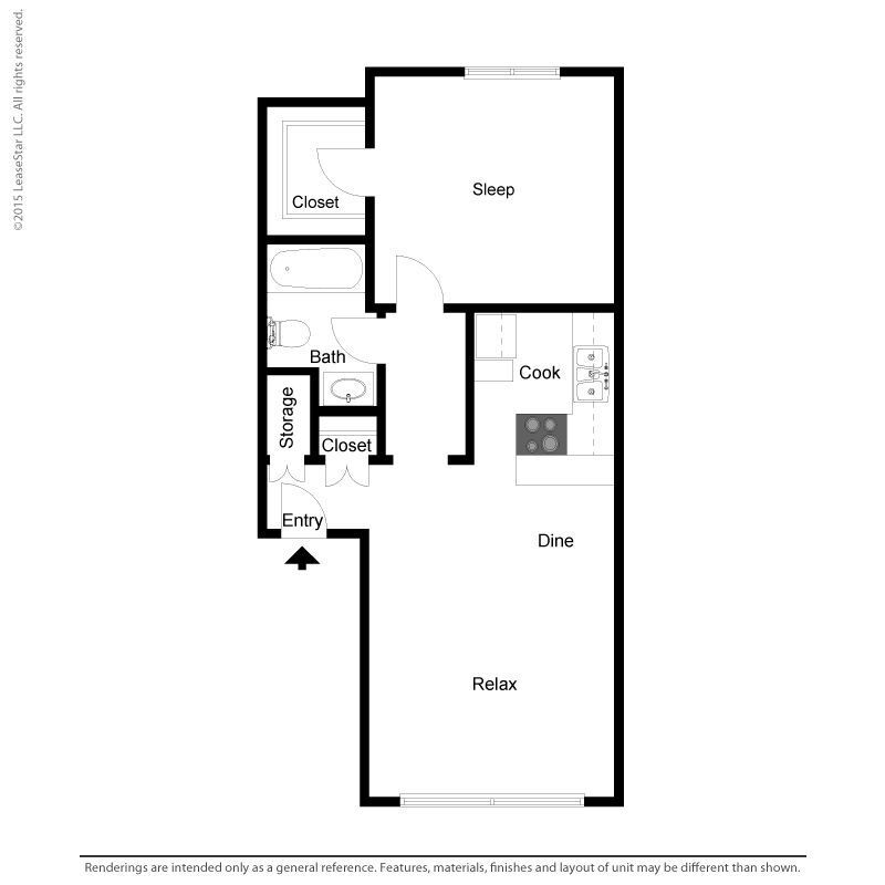 Medium 1 Bed 1 Bath Cozy - Plano 1 Los planos de la planta son una interpretación artística. Todas las dimensiones son aproximadas. Los tamaños o el detalle del producto real y sus especificaciones pueden variar. No todas las características están disponibles en todos los hogares para rentar. Los precios y la disponibilidad están sujetos a cambios. El alquiler que se muestra es mensual. Se pueden aplicar ciertos cargos, por ejemplo, entrega de paquetes, recolección de basura, agua, servicios, etc. Depositos varian. Consulta a un representante para conocer detalles.