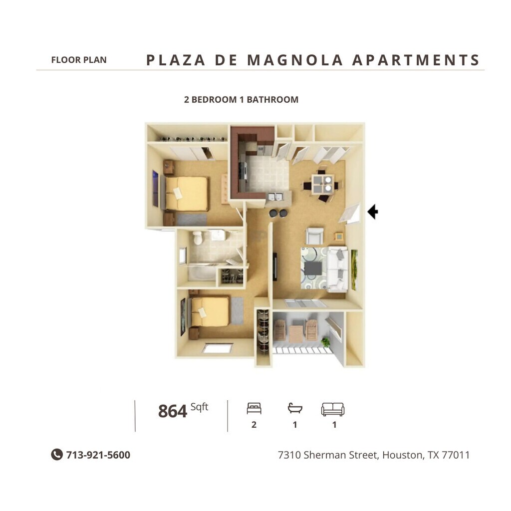 2 Dormitorios, 1 Baño, 864 pies²Disponible AhoraDetalles de Diponibilidad