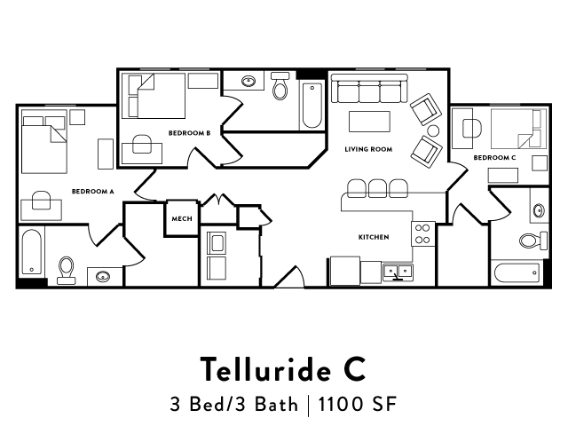 Modelo de apartamento: Telluride C$7253 Dormitorios, 3 Baños, 1100 sq ftDisponible Ahora![]()