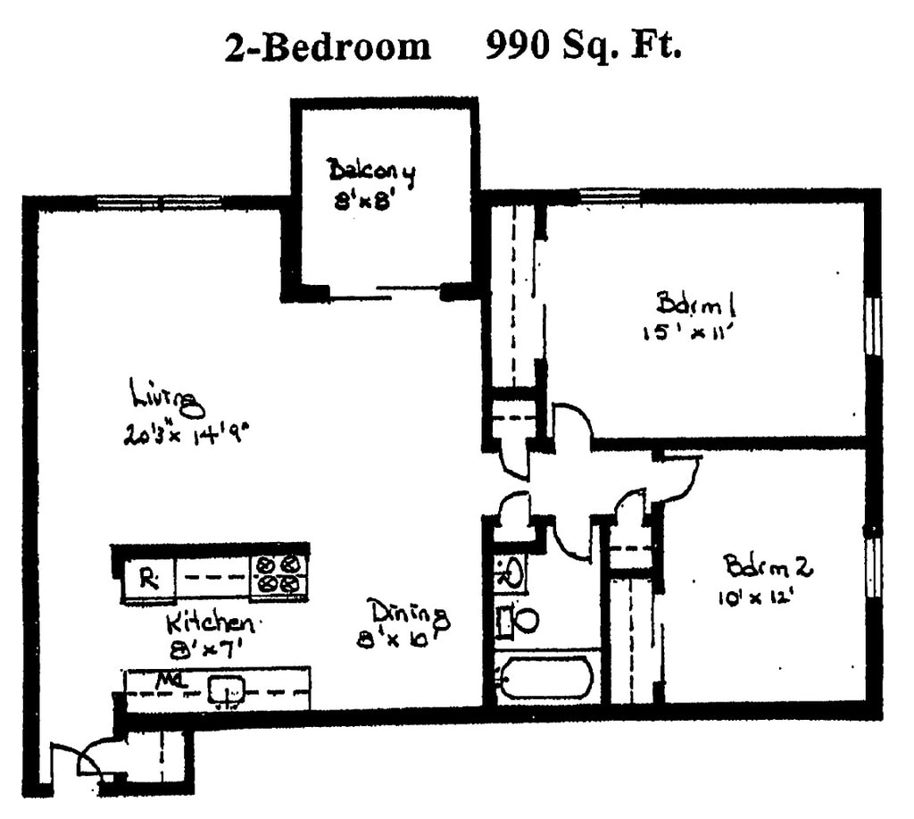 2 Dormitorios, 1 Baño, 990 pies²Disponible AhoraEl más grandeEsta opción tiene las unidades más grandes para este modeloGalería del Modelo