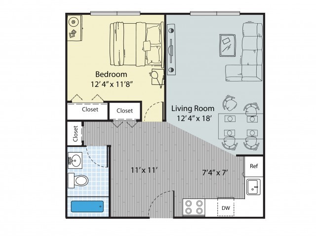 1 Dormitorio, 1 Baño, 704-714 pies²Disponible AhoraEl más grandeEsta opción tiene las unidades más grandes para este modeloGalería del Modelo