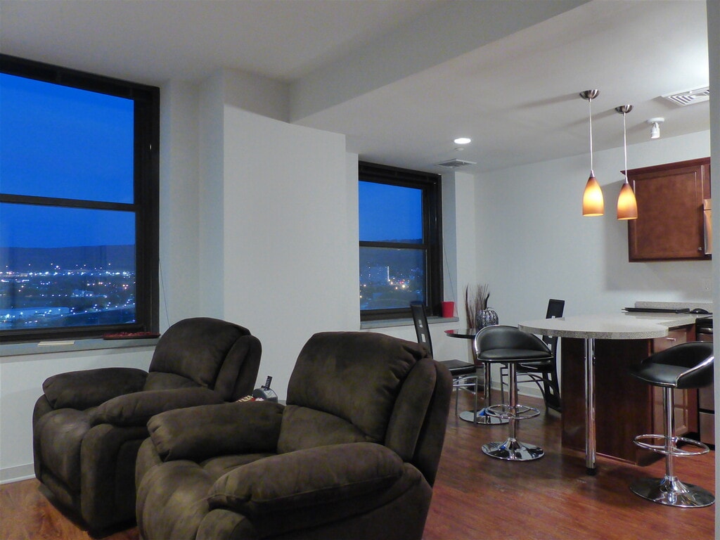 Vida moderna en Public Square en el centro de Wilkes-Barre. Nuestro hermoso apartamento de 2 habitaciones y 1 baño cuesta $2,500 mensuales, e incluye los servicios públicos y un pase de estacionamiento. ¡Llama para obtener más información!