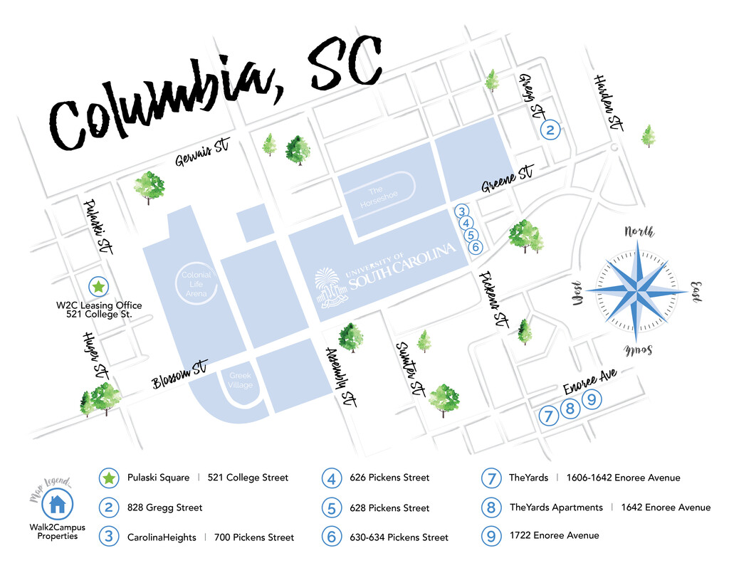 Pulaski Square Townhomes se encuentra en el Barrio The Congaree Vista y el código postal 29201 de Columbia, SC. Esta comunidad está gestionada profesionalmente por Walk2Campus