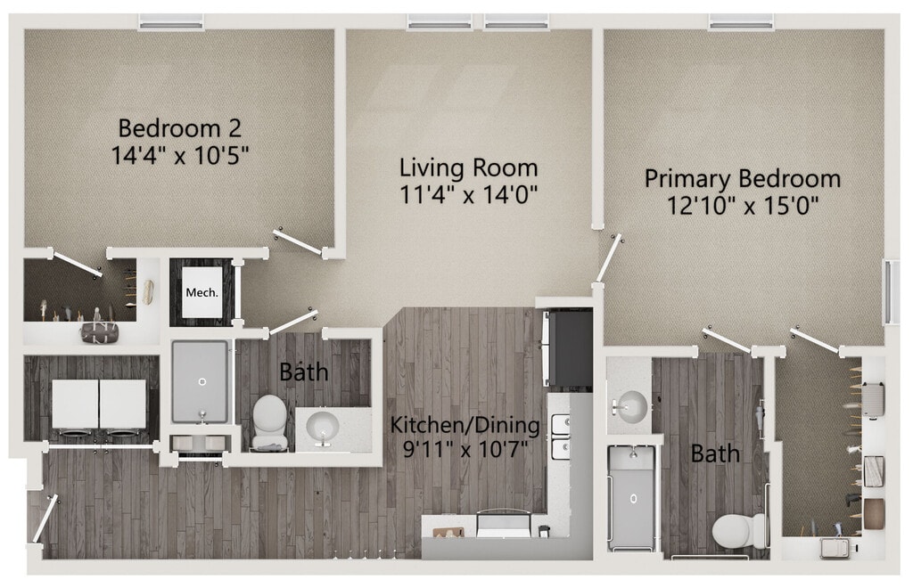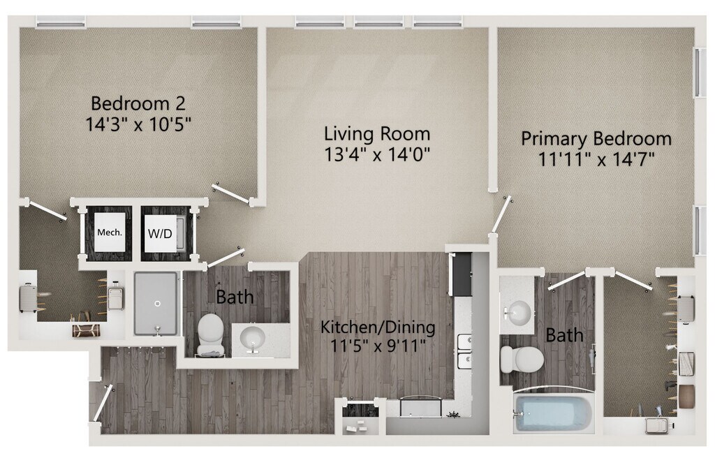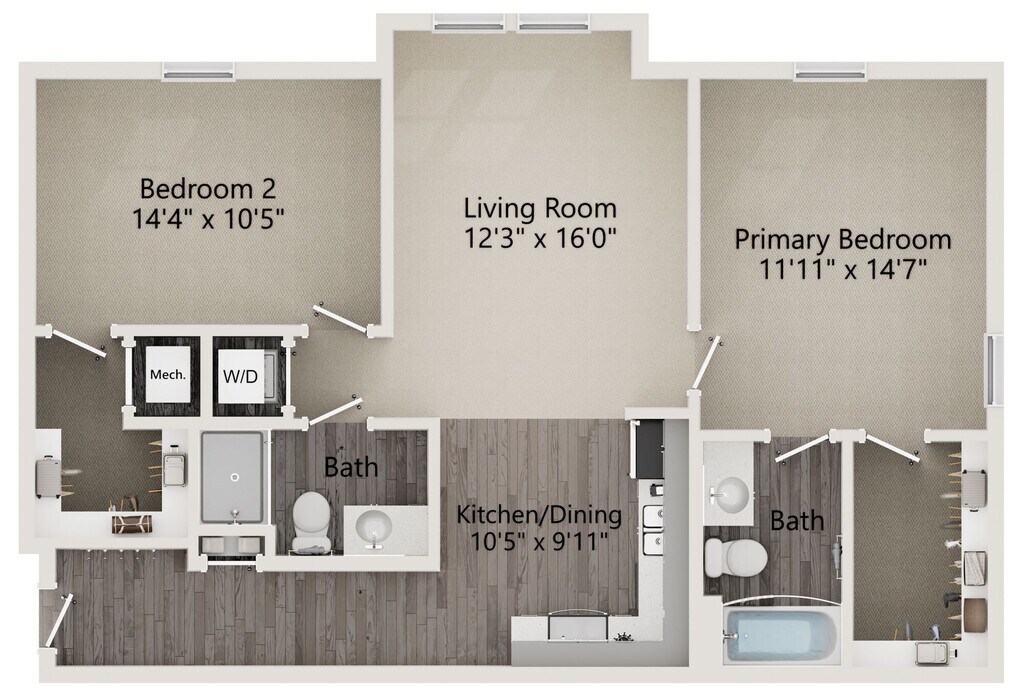 Modelo de apartamento: B2 - Two Bedroom Two bathDesde $1,2792 Dormitorios, 2 Baños, 956 sq ftDisponible AhoraLos planos de la planta son una interpretación artística. Todas las dimensiones son aproximadas. Los tamaños o el detalle del producto real y sus especificaciones pueden variar. No todas las características están disponibles en todos los hogares para rentar. Los precios y la disponibilidad están sujetos a cambios. El alquiler que se muestra es mensual. Se pueden aplicar ciertos cargos, por ejemplo, entrega de paquetes, recolección de basura, agua, servicios, etc. Depositos varian. Consulta a un representante para conocer detalles.