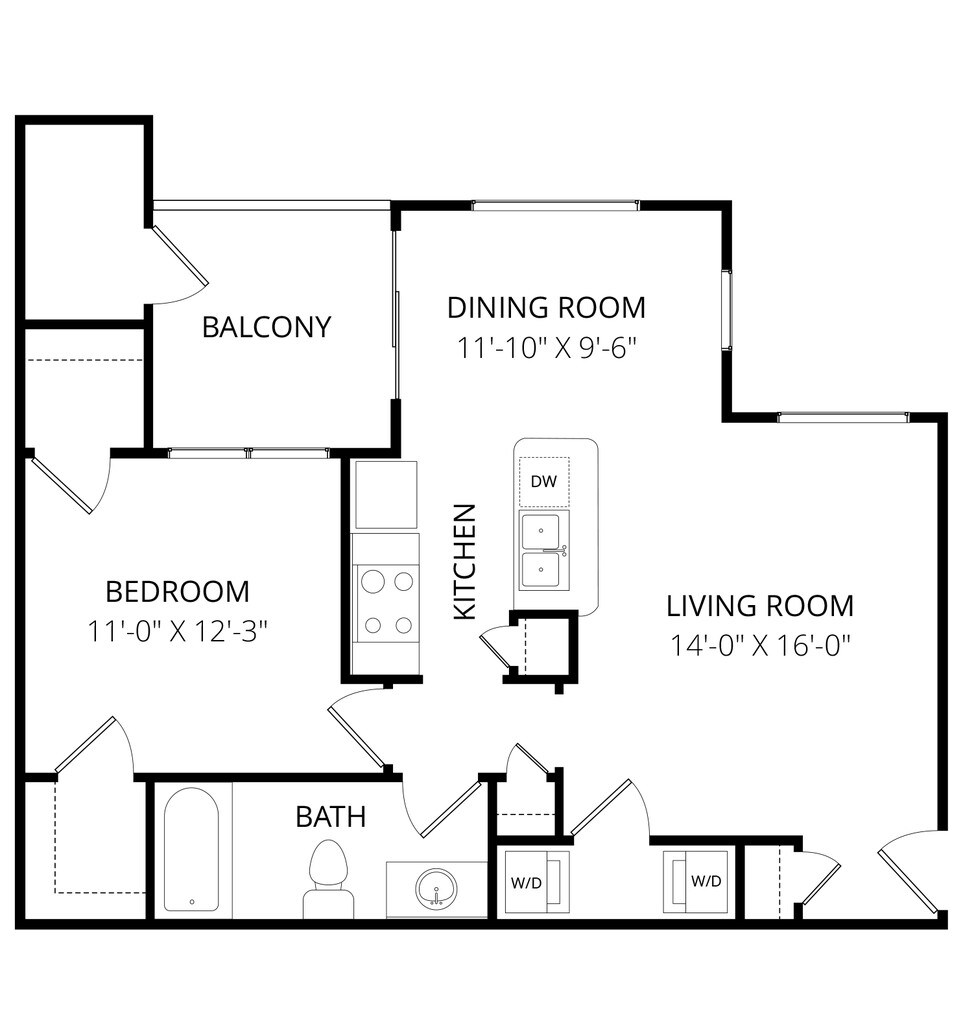 Modelo de apartamento: A2 Red Bud1 Dormitorio, 1 Baño, 791 sq ftDisponible Ahora![]()