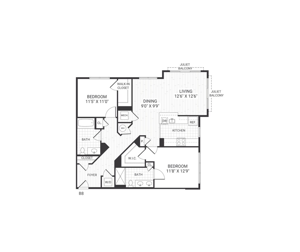 B02 - Plano 1 Unidad de apartamento: 1-1108Modelo de apartamento: B02$6,0672 Dormitorios, 2 Baños, 1170 sq ftDisponible AhoraPlano: B01