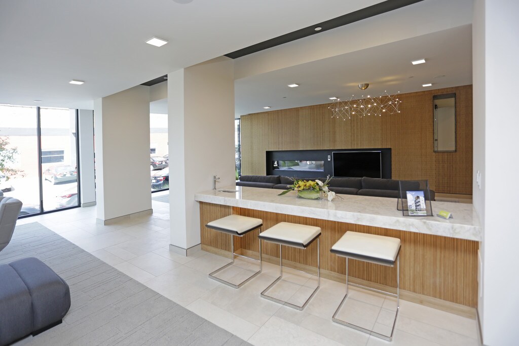- Vestíbulo de vidrio con salón multimedia y barra con fregadero