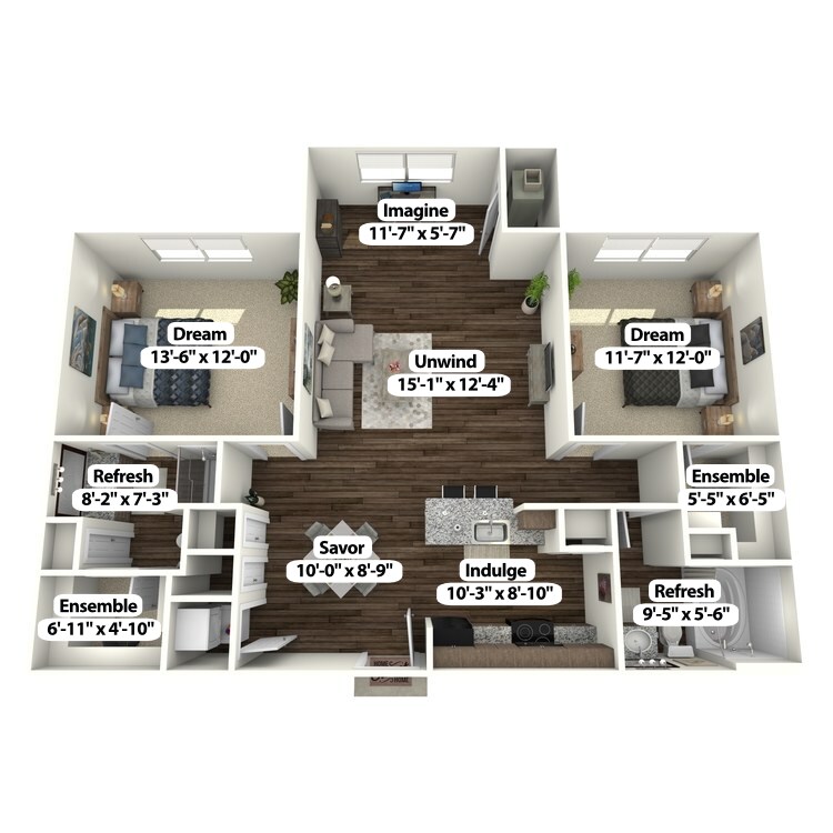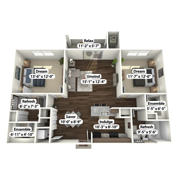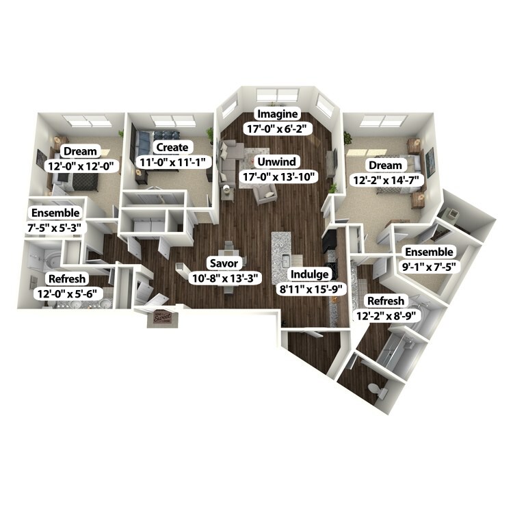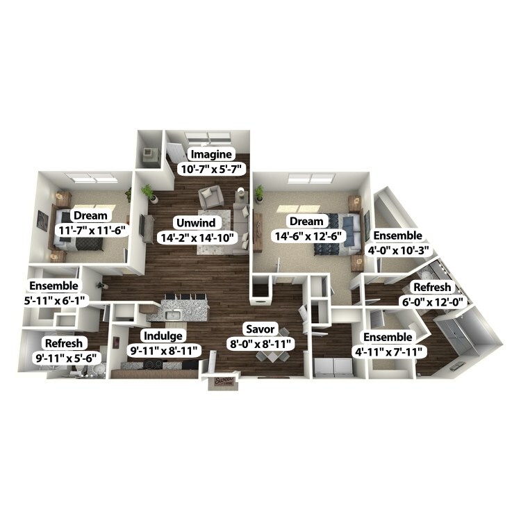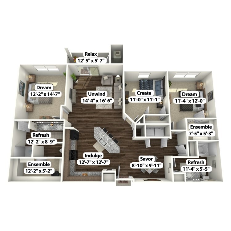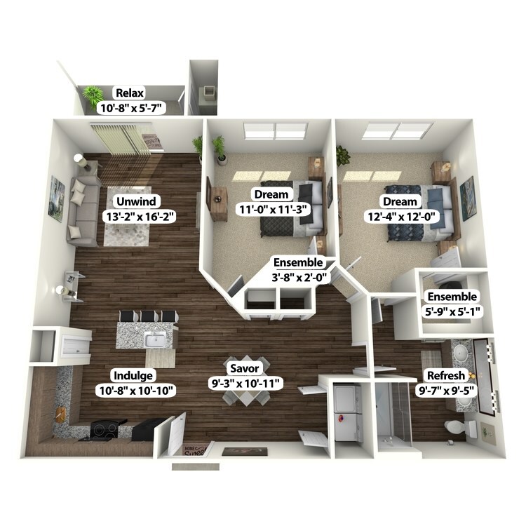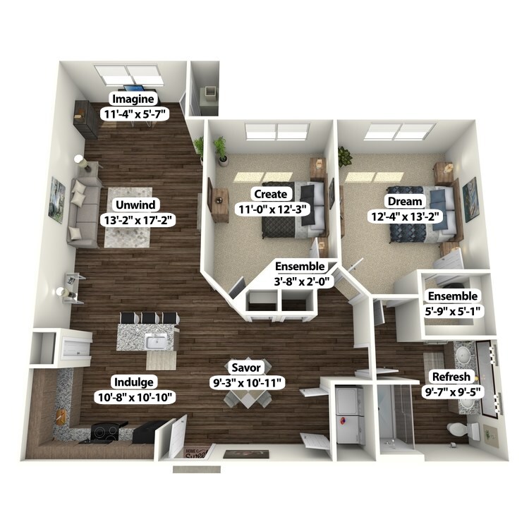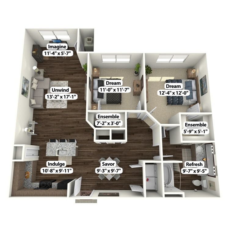 Modelo de apartamento: BrillianceDesde $1,4951 Dormitorio, 1 Baño, 856 sq ftDisponible Ahora![]()