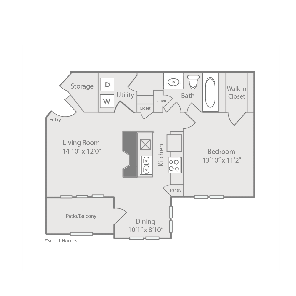 The Tahoe - Plano 1 Unidad de apartamento: 2801LModelo de apartamento: The Tahoe$1,2931 Dormitorio, 1 Baño, 800 sq ftDisponible Ahora2 Dormitorios