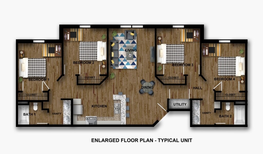 4x2 - Plano 1 Unidad de apartamento: PrivateModelo de apartamento: 4x24 Dormitorios, 2 Baños, sq ftDisponible AhoraUnidad de apartamento: SharedModelo de apartamento: 4x24 Dormitorios, 2 Baños, sq ftDisponible Ahora