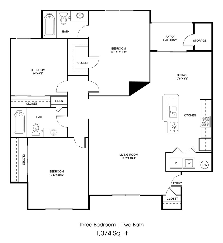 Modelo de apartamento: 3x2Desde $1,2453 Dormitorios, 2 Baños, 1074 sq ftDisponible Ahora![]()
