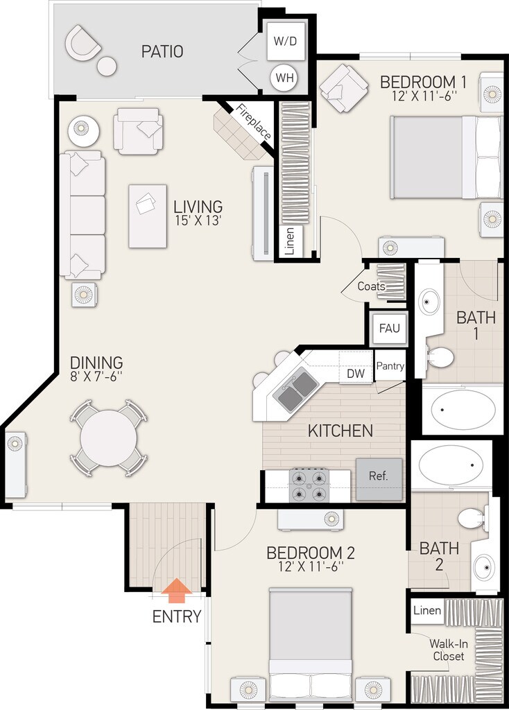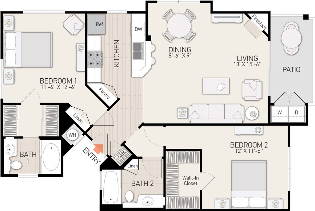 Modelo de apartamento: Plan 2Desde $2,5701 Dormitorio, 1 Baño, 718 sq ftDisponible Ahora![]()