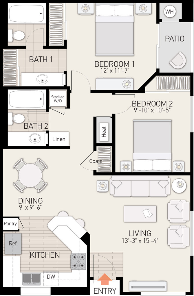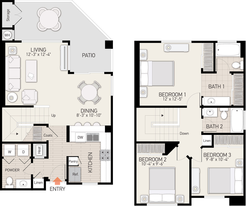 Modelo de apartamento: Plan CDesde $4,0953 Dormitorios, 2.5 Baños, 1205 sq ftDisponible Ahora![]()
