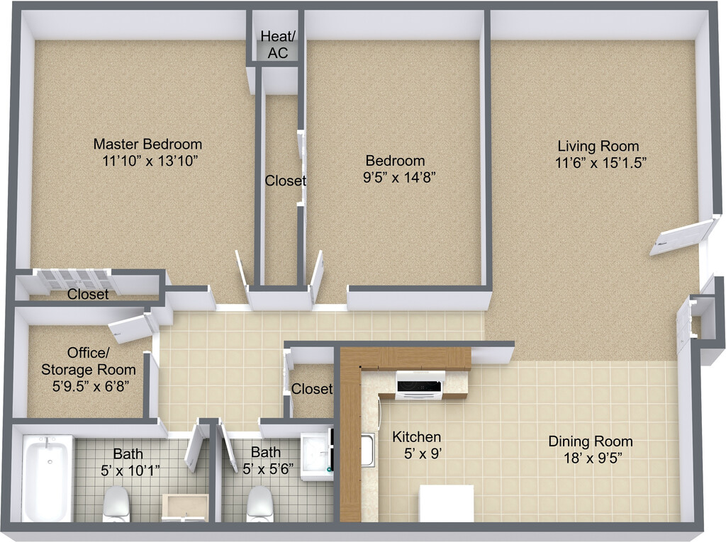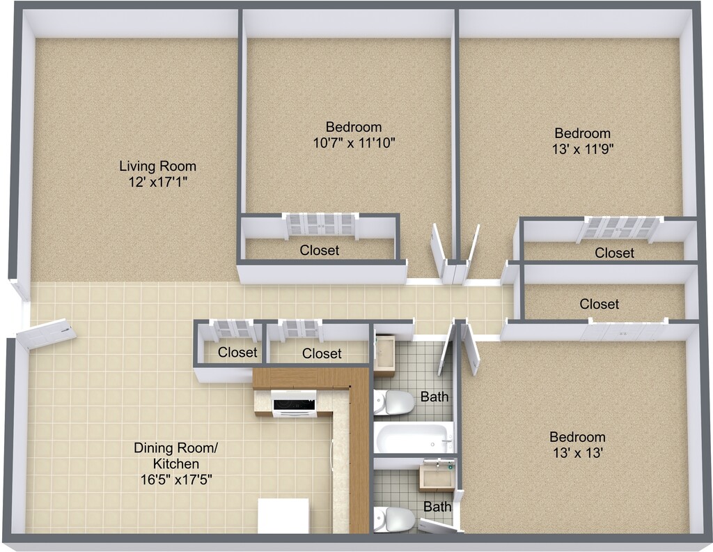Modelo de apartamento: Three BedroomDesde $1,3503 Dormitorios, 1.5 Baños, 1300 sq ftDisponible Ahora![]()