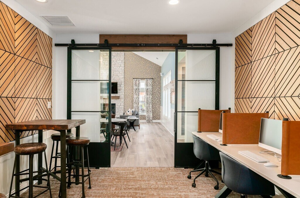 - una sala de estar con espacio para computadoras de trabajo compartido