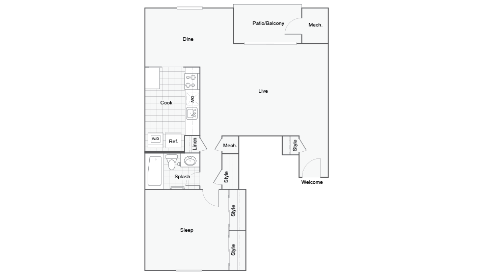 1 Dormitorio, 1 Baño, 830 pies²Disponible January 31, 2026El más grandeEsta opción tiene las unidades más grandes para este modeloGalería del Modelo