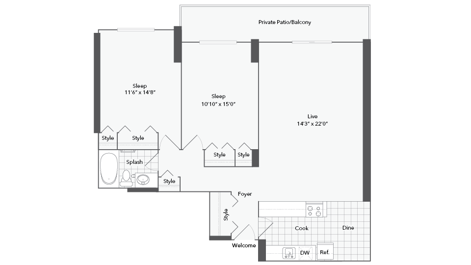 1 Dormitorio, 1 Baño, 712 pies²Disponible AhoraGalería del Modelo