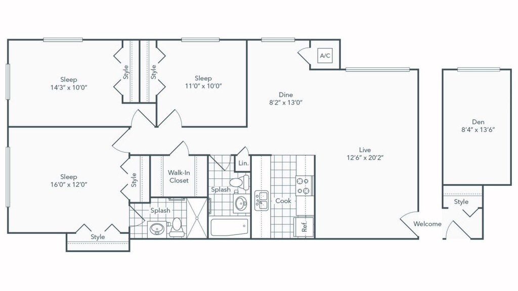 Modelo de apartamento: Douglas DenDesde $2,4853 Dormitorios, 2 Baños, 1495 sq ftNo DisponibleDouglas Den - Plano 1