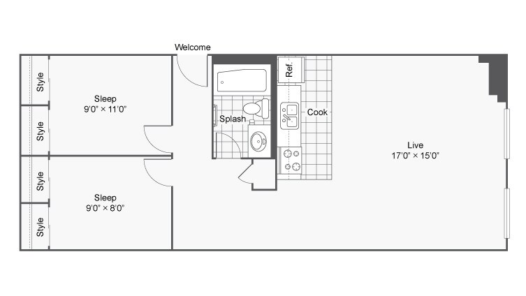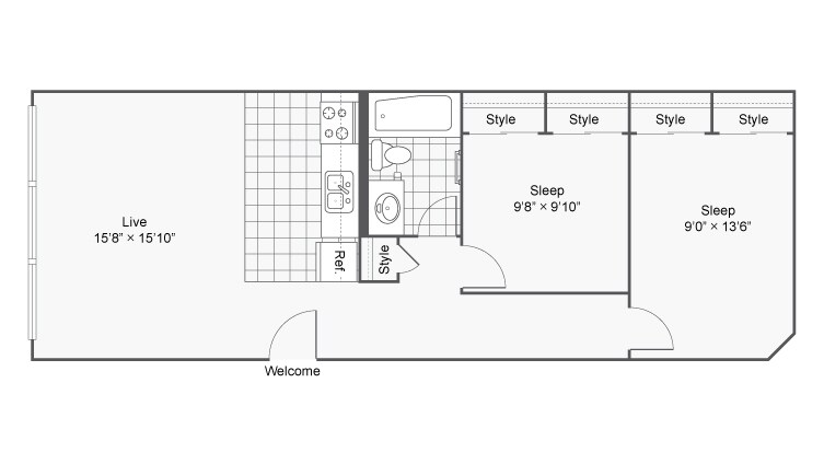 Modelo de apartamento: 2h$1,7452 Dormitorios, 1 Baño, 783 sq ftDisponible Ahora![]()