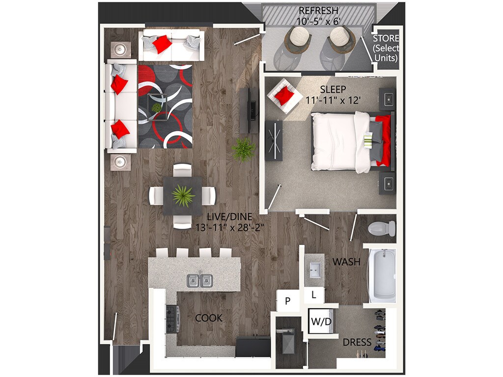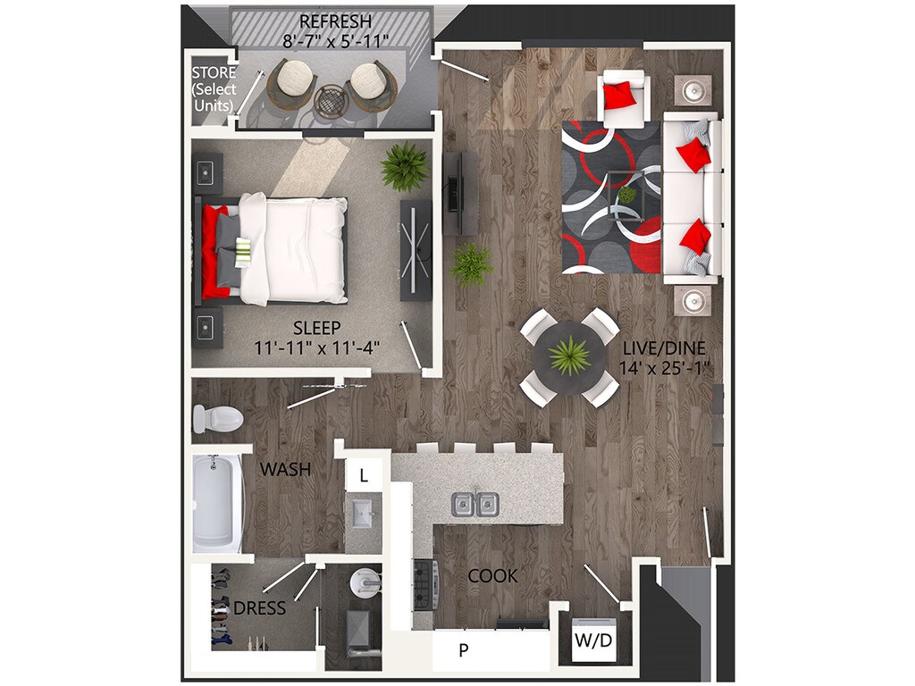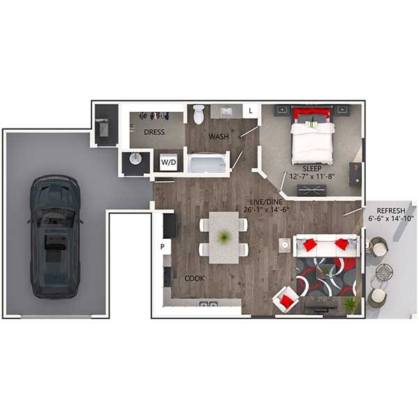 1 Dormitorio, 1 Baño, 806 pies²Disponible AhoraGalería del Modelo